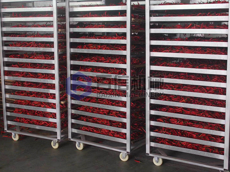 3、二次烘干階段:為保證成品辣椒干貨的品質(zhì),此階段需要辣椒鋪料均勻,堆放不可太厚,保證良好的透氣性,設置溫度在60~70℃,時長在6~8個小時即可。