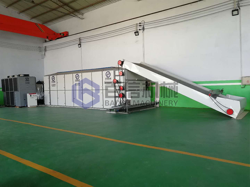 物料從上層進入,花椒鋪料厚度由自動鋪料器控制,在網帶的帶動下,花椒從上層往下 層移動。運行中,有多次往下落的過程,使翻動更完善、干燥更均勻。干燥好的花椒從底層的出料口排出,在此過程中充分和高溫熱空氣充分接觸,達到干燥的效果。